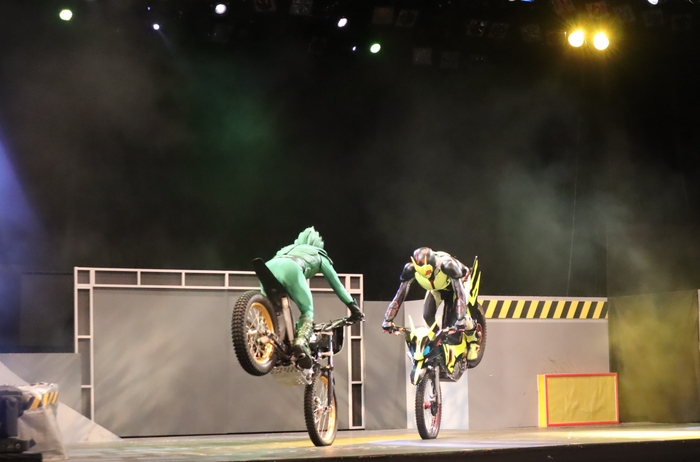 毎年冬の恒例となった東映太秦映画村の「仮面ライダー大集合バトル」。 昨年はオートバイ競技「トライアルバイク」のチャンピオンをはじめ、一流のスタッフが終結したバイクパフォーマンスが登場。耳をつんざくエンジン音とステージを所狭しに繰り広げられるあり得ない神技に大人も魅了され話題となりました。