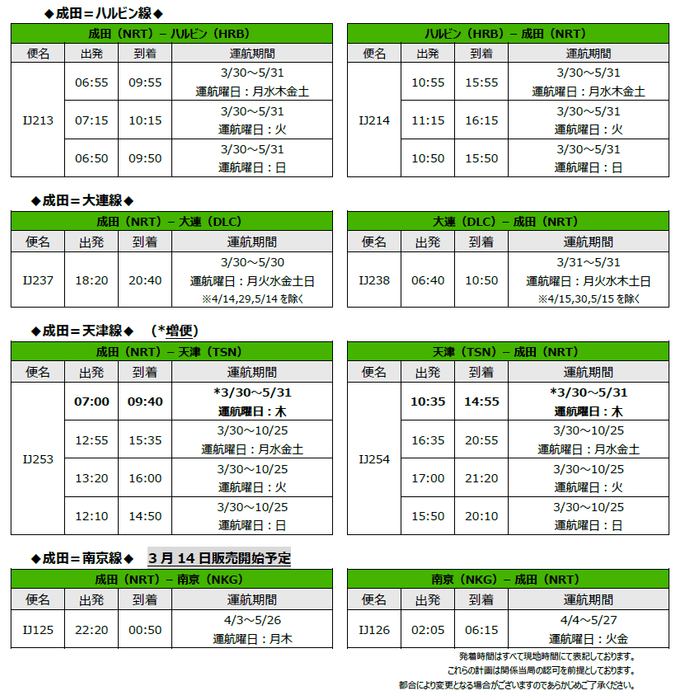 また、成田=南京線についても、3月14日に販売を予定しています。