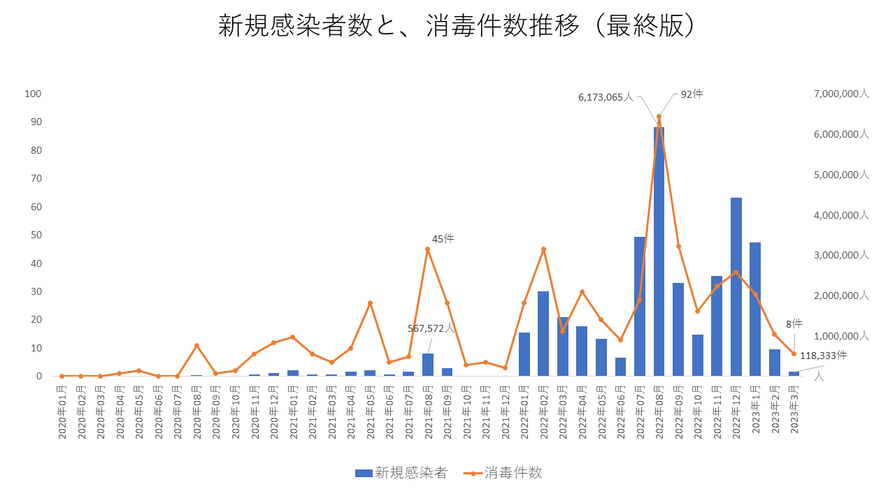 アルコール検知器は本当に新型コロナウィルスを拡散する「危ない」機器だったのか?アルコール検知器の消毒受託件数と新型コロナウィルス感染者数の関係性、最後のレポート2023年3月版