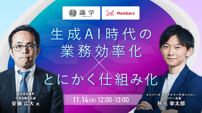 株式会社識学(本社:東京都品川区/代表取締役社⻑ 安藤 広⼤)は、株式会社メンバーズ (本社:東京都中央区/代表取締役社⻑ 髙野 明彦 )と、2023年11月14日にオンラインセミナー『生成AI時代の業務効率化 × とにかく仕組み化』を共催いたします。