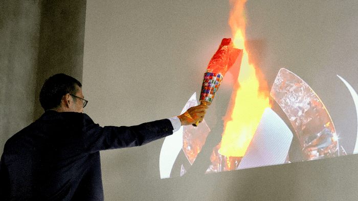 まず、開会式の各国の選手入場シーンの様に、昨年の受賞者がプラカードを持って入場。その後、聖火台がスクリーンに映され、トーチを持った代表が手をかざすと映像に聖火が灯されました。