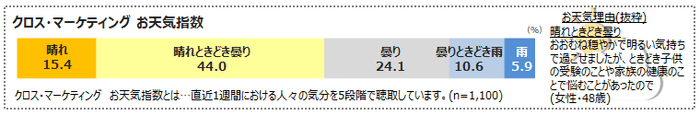 クロス・マーケティングお天気指数とは、直近1週間における人々の気分をお天気で表したものです。お天気の理由も一部抜粋してお知らせします。