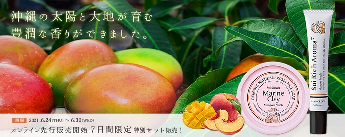 首里石鹸の主力商品である「琉球のホワイトマリンクレイ洗顔石鹸」「SuiRichAroma エッセンスハンドクリーム」に新しい香りとして「マンゴー&ピーチの香り」が加わりました。沖縄の太陽と大地が育む豊潤な香りを表現しました。