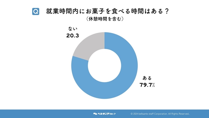 「就業時間内にお菓子を食べる時間はありますか?(休憩時間を含む)」という質問に対して、「ある」と回答した人は79.7%を占めました。「ない」と回答した人は20.3%に留まりました。