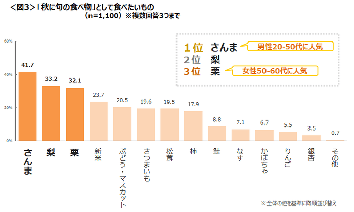 「秋に旬の食べ物」として食べたいものは「さんま」、「梨」、「栗」。今年は「さんま」の価格が高騰しているものの、根強い人気が窺える。