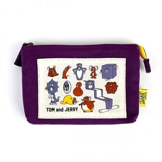 ピンクとパープルカラーが目立って可愛い3ポケットポーチ♪傘に変身したトムやワッフルになっちゃったジェリーなど、いろんな変身シリーズが描かれたポーチ。