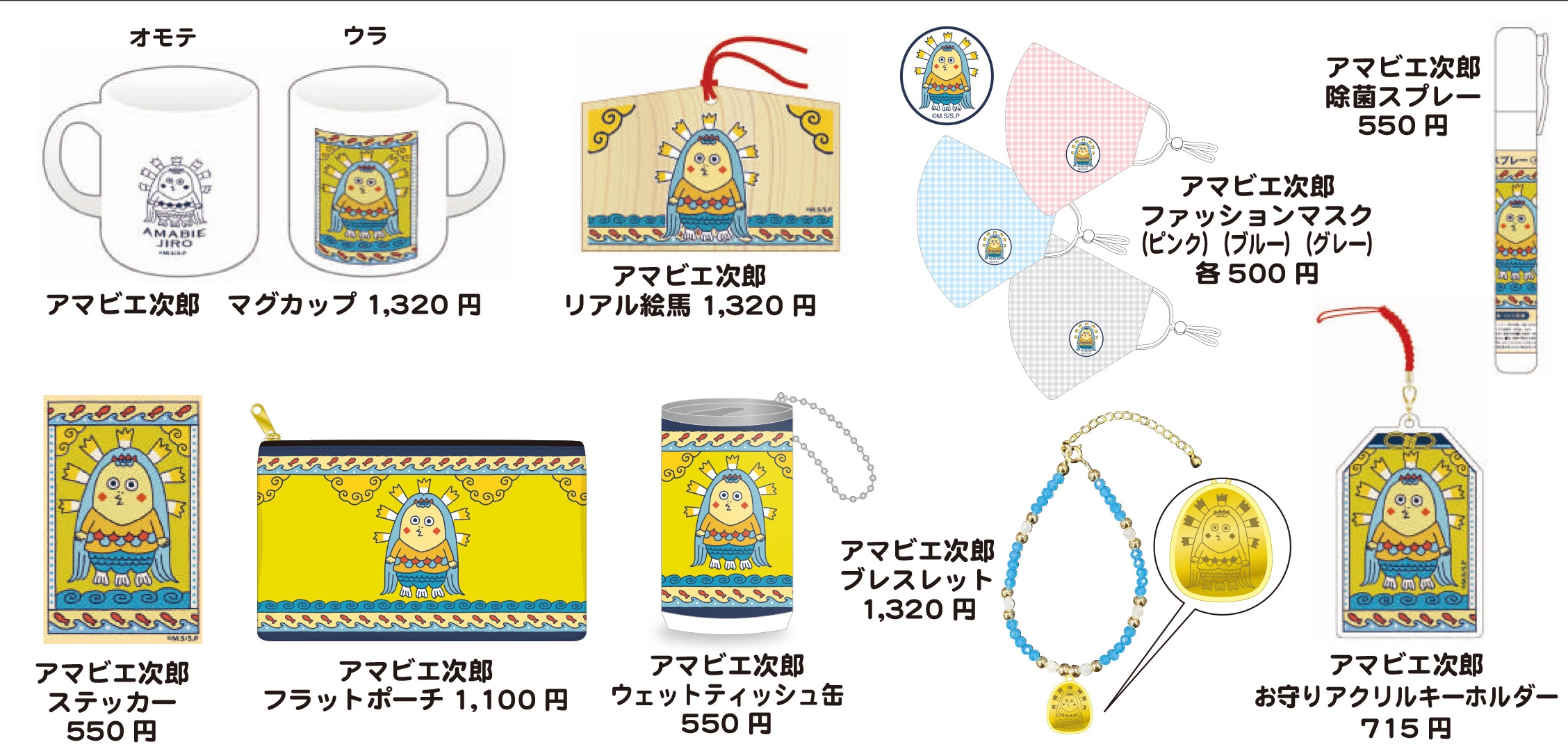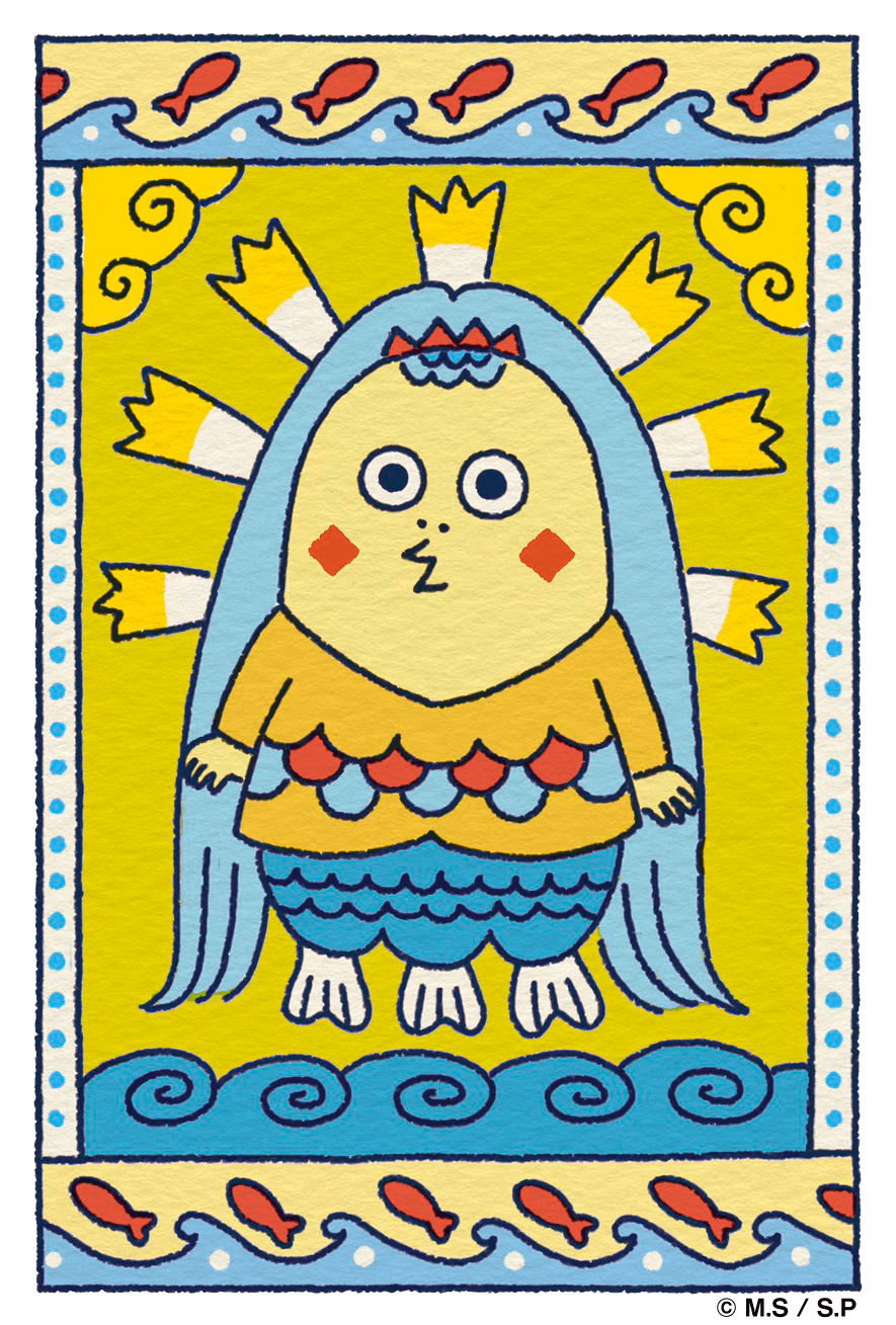 「アマビエ」は、江戸時代末期に肥後国(現:熊本県)に現れたとされる日本古来の妖怪で、「疫病が流行した際は、私の姿を描いた絵を人々に見せよ」と言い残し海へ消えたと伝えられています。昨年、『コジコジ』に登場する半魚鳥の「次郎」が「アマビエ」に似ているとSNS上で話題になりました。同フェアでは、「次郎」がアマビエ姿になった「アマビエ次郎」のアートを使用した新商品を販売いたします。