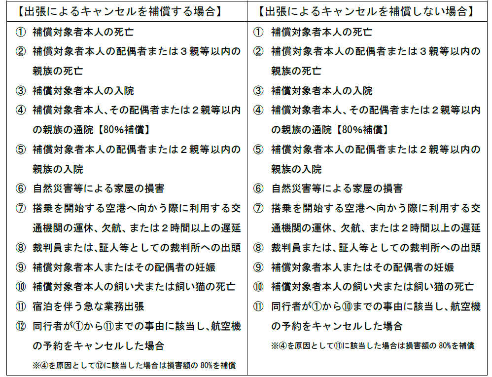 航空券キャンセル保険は、航空会社にて航空券の購入をしたものの、下表のいずれかの事由に該当し、航空機の予約をキャンセルした場合に、被保険者に生じる取消手数料等を補償する保険です(各事由の詳細は、「保険約款」をご参照ください。)。
