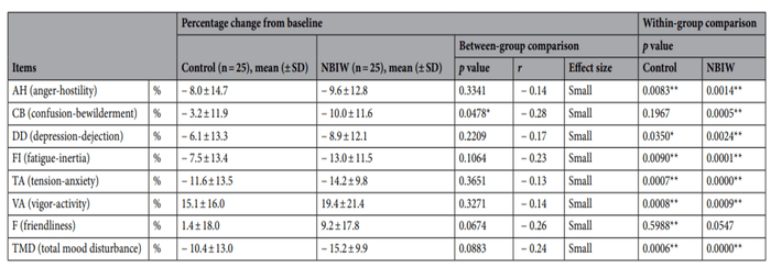 また、POMS2による気分評価においても、中性重炭酸イオン水(NBIW)温浴が精神的ストレスに対してより高い軽減作用があると評価されました。