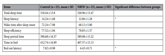 ピッツバーグ睡眠質問票日本語版(PSQI-J:Pittsburgh Sleep Quality Index Japanese version)により、通常入浴よりも中性重炭酸イオン水(NBIW)温浴で睡眠の質に関して有意な改善を認めました。また、活動量計でも通常入浴よりも中性重炭酸イオン水(NBIW)温浴で睡眠潜時(ベッドに入ってから入眠までに要する時間:寝つきの良さを反映)と離床潜時(目覚めてからベッドを離れるまでに要する時間:寝覚めの良さを反映)に関して有意な改善を示し、中性重炭酸イオン水(NBIW)温浴がよりよい睡眠に関して有効であることが実証されました。