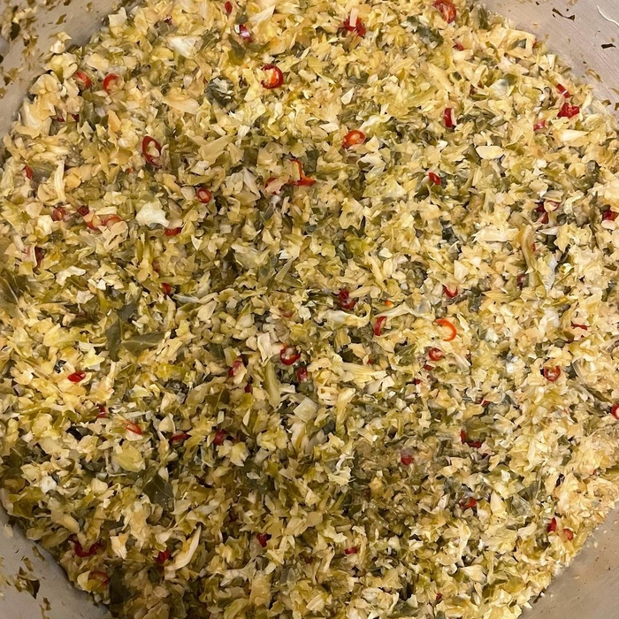ビタミンCがたっぷり含まれているのにも関わらず、キャベツメンチで使用の出来ないキャベツの外葉を、カツオだしをベースに唐辛子と生姜でピリ辛酸っぱく仕上げました。