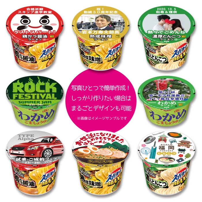 【MYカップ麺】は、誰もが目にしたことのあるエースコックの【スーパーカップMAX】の醤油・味噌・とんこつ、そして【わかめラーメン】の通常サイズとミニサイズの、合計5種類のシール蓋をオリジナルで作ることができる大人気のノベルティアイテムです。ラベル全体をお好きなデザインで作るオリジナルタイプ、写真とテキストを送信するだけでお手軽に作れるセミオーダータイプ、いずれかの方法であなただけのカップ麺を作ることが可能です。