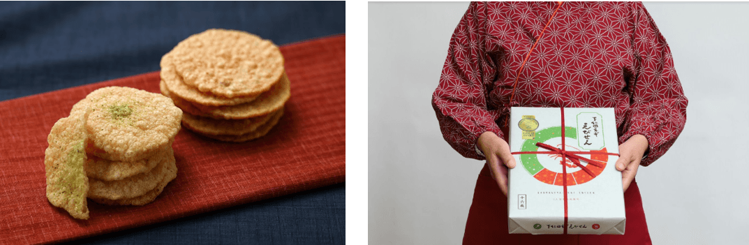 天然えびを加えたペースト状に加工した生地を、11日間熟成することにより、天然えびの素材本来の味わいや風味を醸し出しています。さらにJA甘楽富岡推奨の下仁田ねぎを乾燥し、香りをギュッと閉じ込めた粉末を使用しています。口いっぱいに広がる下仁田ねぎの香りと、サクサクっとした食感を楽しめる本格派えびせんです。