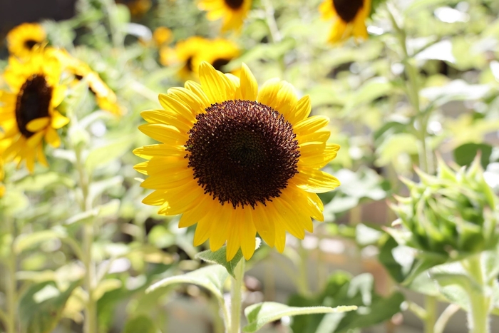 都市養蜂のミツバチも訪れ、青空の下で満開のひまわりを堪能
