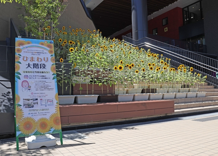 医療法人医誠会(本社:大阪市、代表者:谷 幸治)の運営する医療複合施設「i-Mall」に8月16日「ひまわりの大階段」が登場しました。このイベントはホロニクスグループのSDGsチャレンジプロジェクトの一環として実施されました。120鉢360株のひまわりが青空の下で満開をむかえました。多くの人が足を止め黄色に染まった大階段を見上げ、フォトスポットでは色々な撮影が行われました。