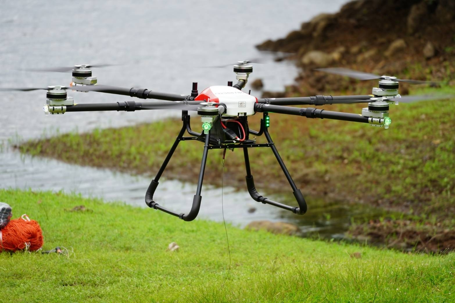 飛行デモではこれまで一日がかりの重労働だった山の上までの運搬を、25kgのネットやパイプを同時に吊って僅か3分で到着。