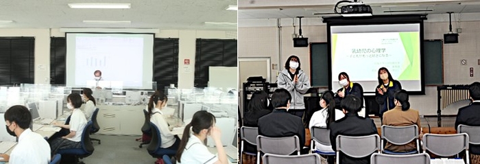保育科では、隣接する附属幼稚園を見学し、模擬授業では、言語・非言語コミュニケーションについて、遊びを通して学ぶ「ジェスチャーゲーム」を体験します。