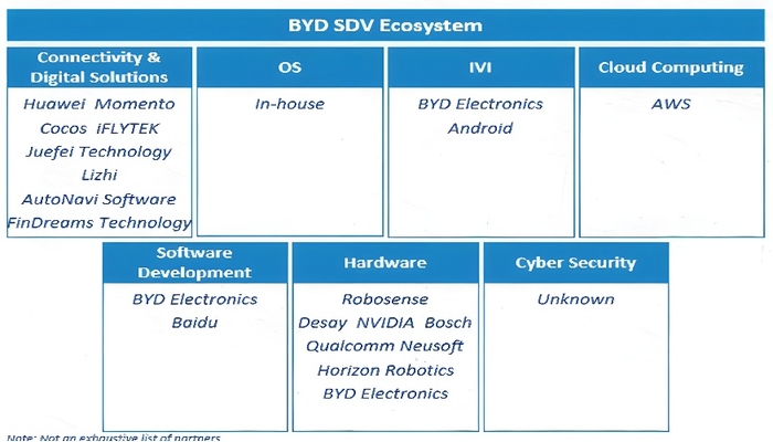 BYD は自社内でソフトウェア機能を積極的に開発しているが、特定の分野では依然としてサプライヤーに依存している。同社は専門知識のギャップを埋めるために他の BYD グループ子会社と協力している。Nio は自社内でのソフトウェア開発を重視しており、自動運転 (AD)、デジタル コックピット、インテリジェント シャーシなどの主要なシステムを完全に制御している。Nio は非コア分野で外部パートナーと提携しているが、外部ソリューションへの依存を最小限に抑えることを目指している。
