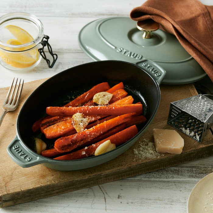 調理したらそのまま食卓にだせて、お皿要らず。浅型で取りやすく、食事の間も温かさを保ちます。
