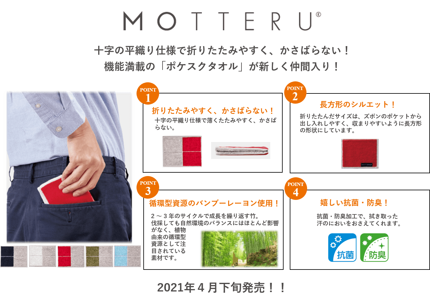 株式会社トレードワークス(本社:東京都渋谷区)は、エシカルブランド「MOTTERU(モッテル)」より「ポケスクタオル」を4月下旬より発売します。