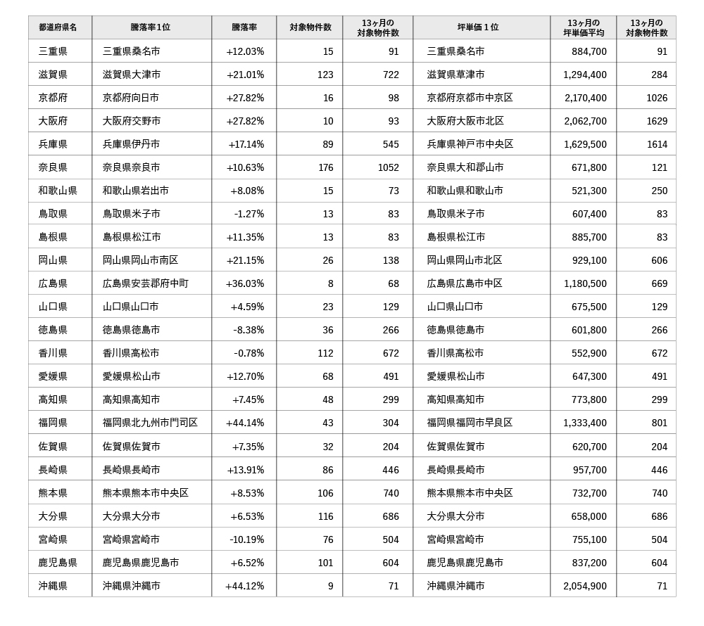 ・各都道府県での1位の騰落率がマイナスとなっている県は9県。