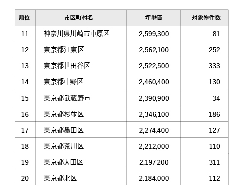 ・上位10位までは東京が占めるが、11位に武蔵小杉駅のある「神奈川県川崎市中原区」がランクイン。