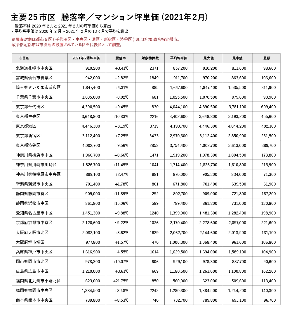 「不動産×WEB×ビッグデータ」の領域で、さまざまな不動産テックサービスを展開する株式会社ワンノブアカインド(本社:東京都港区、代表取締役社長:川島 直也、以下当社)は、当社が運営するマンション情報サイト「マンションレビュー」の保有データを元にした、2021年2月の全国市区町村における「マンション坪単価」および前年同月と比較した「騰落率」のランキング、都心5区(千代田区・中央区・港区・新宿区・渋谷区)に20政令指定都市を加えた主要25市区での「マンション坪単価」の変遷を調査し、発表いたしました。