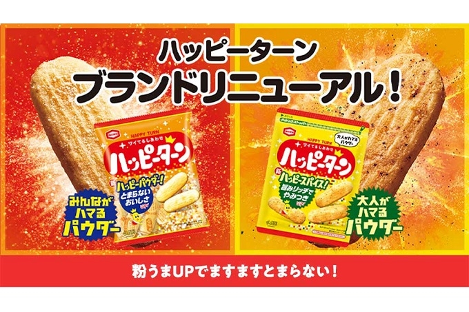 「ハッピーターン」が5年ぶりにリニューアル! “新”ハッピーパウダーで 粉うまUP!