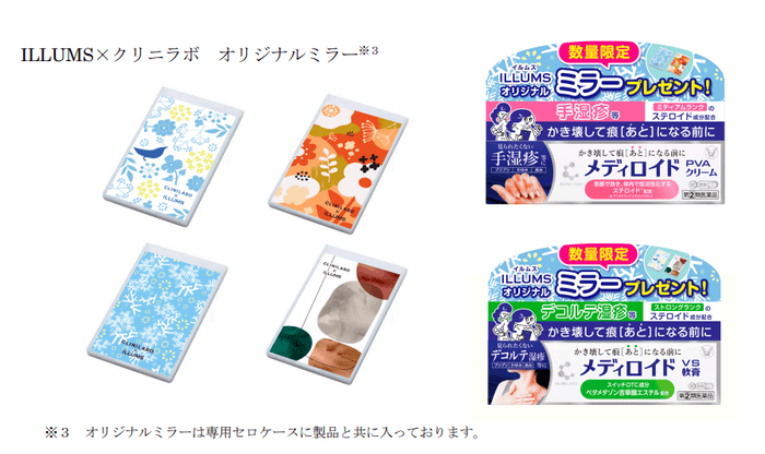 今回の発売を記念し、メディロイドシリーズをお買い上げいただいた方に数量限定で、人気の北欧雑貨・インテリアブランドILLUMSとコラボレーションした「ILLUMS×クリニラボ オリジナルミラー」をプレゼントいたします。オリジナルミラーはメディロイドシリーズをお肌に塗る際はもちろんのこと、普段使いにもお使いいただける4種のデザインとなっています。