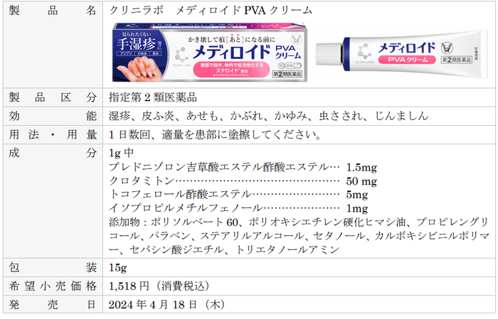 大正製薬株式会社[本社:東京都豊島区 社長:上原 茂](以下、当社)は、肌ケアブランド “CLINILABO(クリニラボ)”から、周囲に見られたくない手湿疹やデコルテ湿疹等をケアするステロイド外用剤「クリニラボ メディロイドPVAクリーム」「クリニラボ メディロイドVS軟膏」を、『よいお肌の日』である2024年4月18日(木)に全国のツルハホールディングスの薬局・薬店※1及びAmazon、楽天などにて発売いたします。