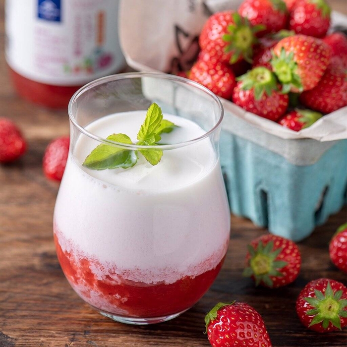 牛乳と混ぜて、たっぷり9杯分が飲める大容量タイプ。炭酸で混ぜて、いちごソーダで飲むのもおすすめです!