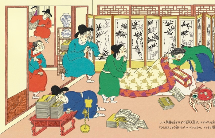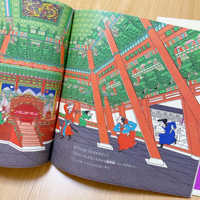 姿を消してしまった世宗大王がどこかで様子をみています。どこにいるのか探して楽しむことができる絵本です。