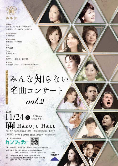 日本では知られていないけれど世界各地ではとてもポピュラー。そんな声楽の名曲を集め、日本ではまず聴くことのない曲を演奏する『みんな知らない名曲コンサート』。好評の昨年に引き続き、今年もハクジュ・ホールで開催いたします。そのクオリティの高さは格式あるハクジュ・ホールも認めるもの*。「東京ライブステージ応援助成」の助成もいただき、華やかに開催いたします。