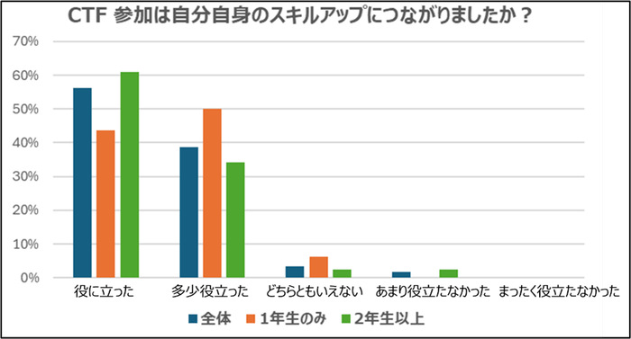 セキュリティやITを学ぶ学生にとってスキルアップにつながったか否かは、主催者として気になるところですが、「役に立った」と回答した参加者が全体の約6割弱でした。日常の勉学とは違った視点で学べるのもCTFの魅力です。