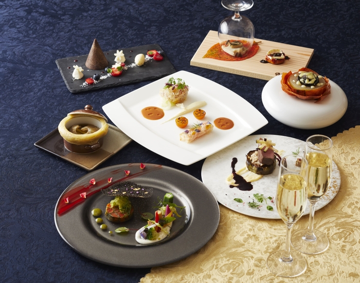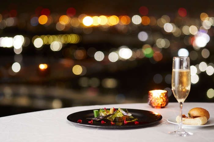 ホテル アゴーラ リージェンシー 大阪堺では、見た目も鮮やかなオードブルから、トリュフやキャビアを添えたメニューなど、本格的フレンチを乾杯のファーストドリンクからはじまる、見た目から味わいまでシェフのこだわりが詰まった全10品のコースをご用意。メインディッシュは、和牛フェレ肉または高級フレンチコースのメインでもよく使われる鹿肉のどちらかをお選びいただけます。料理に合わせてセレクトした赤・白ワインのペアリングとともに大阪ベイエリアの夜景を一望でき、エレガントで洗練された雰囲気の中、都会の喧騒を忘れてゆったりと極上な時間をお過ごしいただけます。