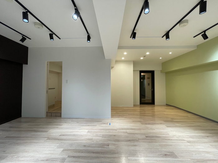 もともと住居として使われており、2部屋あったため入り口が2つあります。室内は綺麗にリニューアルされ、入って左手の壁は淡いグリーンのアクセントクロスが爽やかな印象を与えてくれます。正面には三角形の広めの人工芝が敷かれたバルコニーがありベンチとテーブルを置いてリフレッシュスペースとして使いたいです。