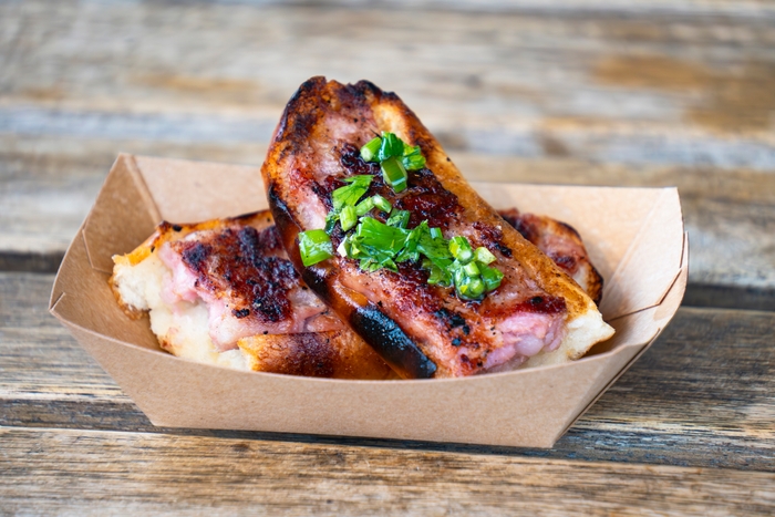 ■地元のパン屋さんと連携しご用意したグリルソーセージパン。給食で食べたあのコッペパンが大変身!グリルソーセージパン:500円(税込み)