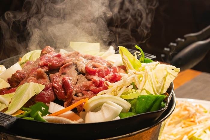 さらに、夜営業では北海道のご当地グルメ「ジンギスカンセット」もご用意。分厚い鉄で出来たジンギスカン用の鍋に、野菜や羊肉を次々と載せて焼き、特製タレで召し上がっていただきます。健康にやさしいヘルシーメニューとして、女性を中心に人気です。