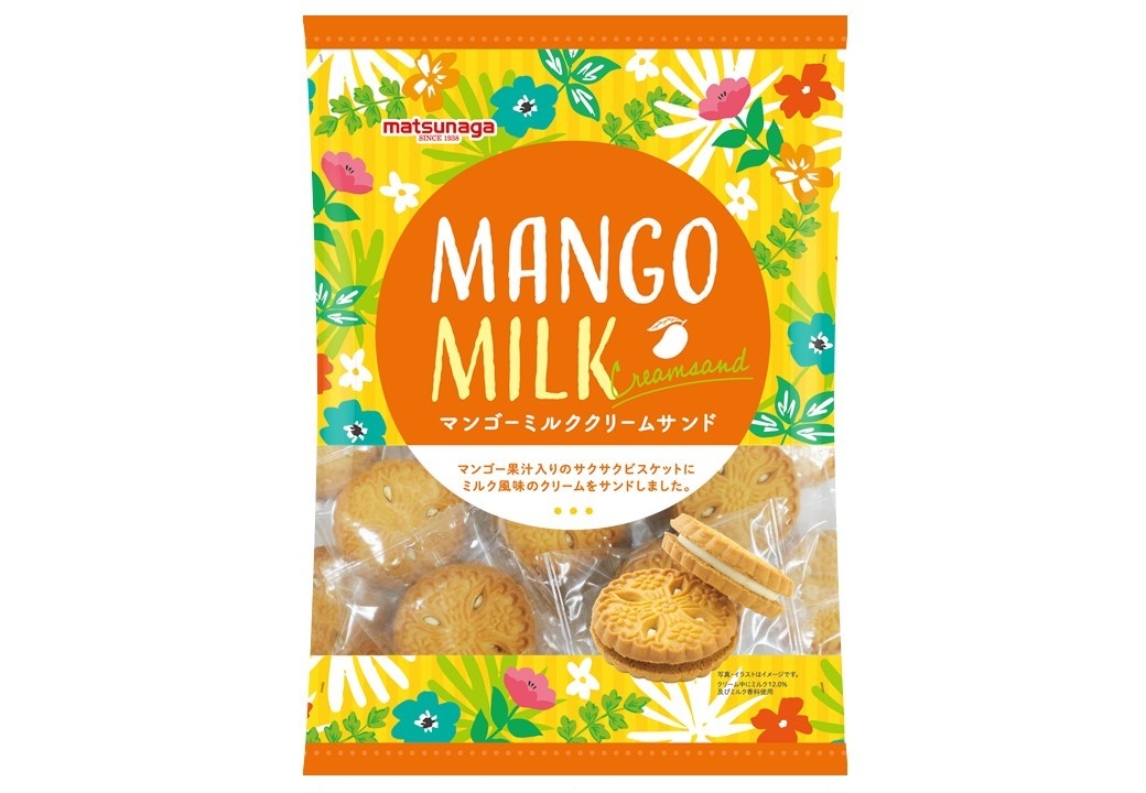 マンゴー果汁入りのビスケットにミルク風味のクリームをサンドしました。