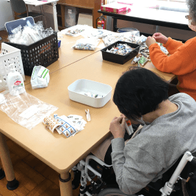 泉の家は、“一人ひとりを大切に「うれしい」と「たのしい」が見つかる場所”をコンセプトに、障害福祉事業を多機能型で行い、 地域での自立生活を支えるための支援に取り組んでいます。イベントでは、揚げせんべいや、いろんな用途に使えるよう30種類以上ものデザインがあるぽち袋、シールと封筒がセットになったメッセージカード、主婦層に好評なレインボーパッド(油とりパッド)、毛糸と刺繍糸でつくった2種類のミサンガ、犬用クッキーを販売いたします。1枚1枚手作りでつくっている揚げせんべいは、1口サイズで食べやすいという声を多くいただいています。心を込めて作った揚げせんべいを、是非この機会にご賞味ください。