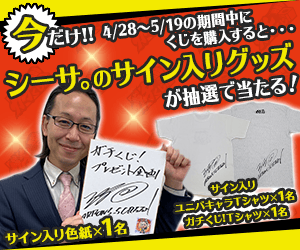さらに、このGWキャンペーン開催期間中(4/28~5/9)に、『ガチくじ!』で「くじを購入したお客様」限定、抽選で3名の方に、人気ライター『シーサ。』氏のサイングッズプレゼント企画を実施いたします!(サイン入り色紙 ×1名様、サイン入りユニバキャラクターTシャツ ×1名様、サイン入りガチくじ!Tシャツ ×1名様)