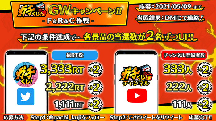 4月28日から5月9日までは、Twitter『ガチくじ!』公式アカウント(@gachi_kuji)でのフォロー&リツイート大キャンペーンを実施いたします!!Amazonギフト券やくじで使えるジェムなど、豪華景品が抽選で当たるキャンペーンは、5/9まで開催!期間中の総RT数や『ガチくじ!』Youtube公式チャンネルの登録者数など、条件達成に応じて、各景品の当選数が2名づつどんどんUPしていくキャンペーンも同時開催します。この機会に、是非キャンペーンにご参加の上で、『ガチくじ!』をお試しください!