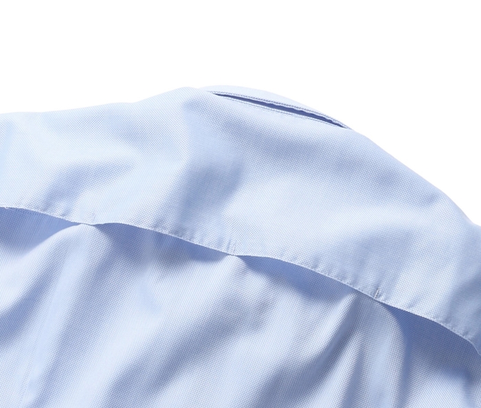 今回のビジネスシャツは、熱がこもりやすい襟後ろから肩部分の内側にかけて吸水速乾性に優れたメッシュ素材「ソアスター®」を採用しました。この素材は、繊維の断面をY字型にすることでできた溝が素早く水分を吸収し、外に拡散します。さらに、背中部分にはスポーツウエアなどにも多く使用されるベンチレーション(通気口)を設置しました。これによって、衣服内に空気の通り道ができ熱を外へ逃がします。この2つの機能から、熱の放出と速乾性の効果がより高まり“ムレ”や“ベタつき”を軽減し、サラッとした着心地が特徴です。