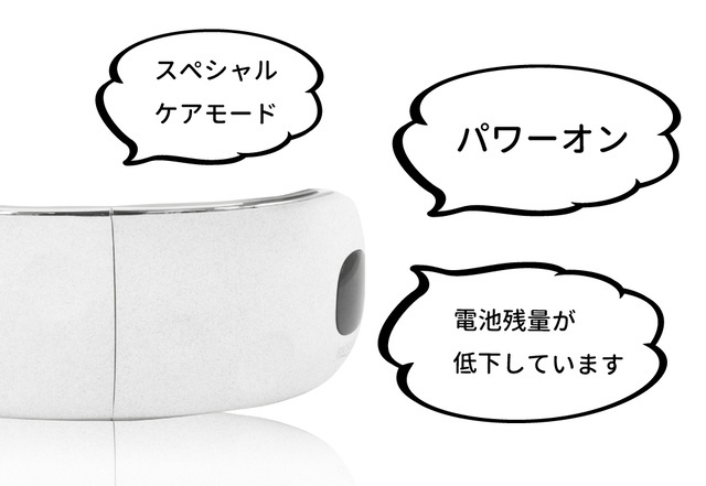 アイフレッシャー ラナを装着したままでも操作ができるよう、音声ガイドを搭載しました。モード切り替えや設定など、全ての操作を優しい女性の声色でお知らせします。不要の場合は、音量を一番下まで下げることで無音にすることが可能です。