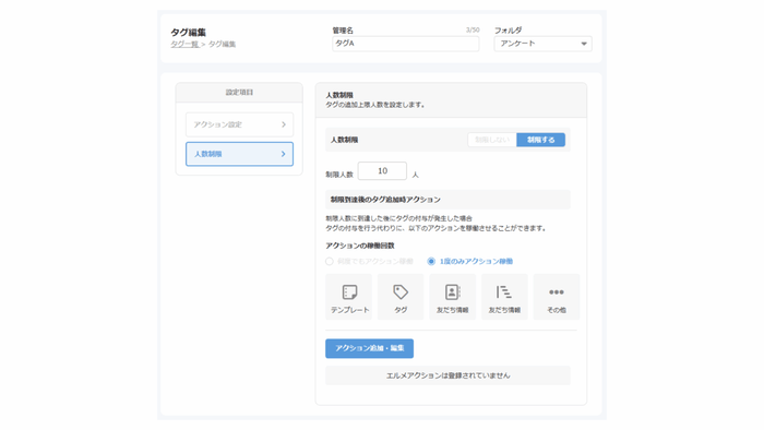 また、上限に達した場合には、タグ付与に代わり「キャンペーン終了のお知らせ」など、あらかじめ設定したアクションを自動実行することも可能です。