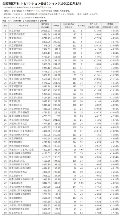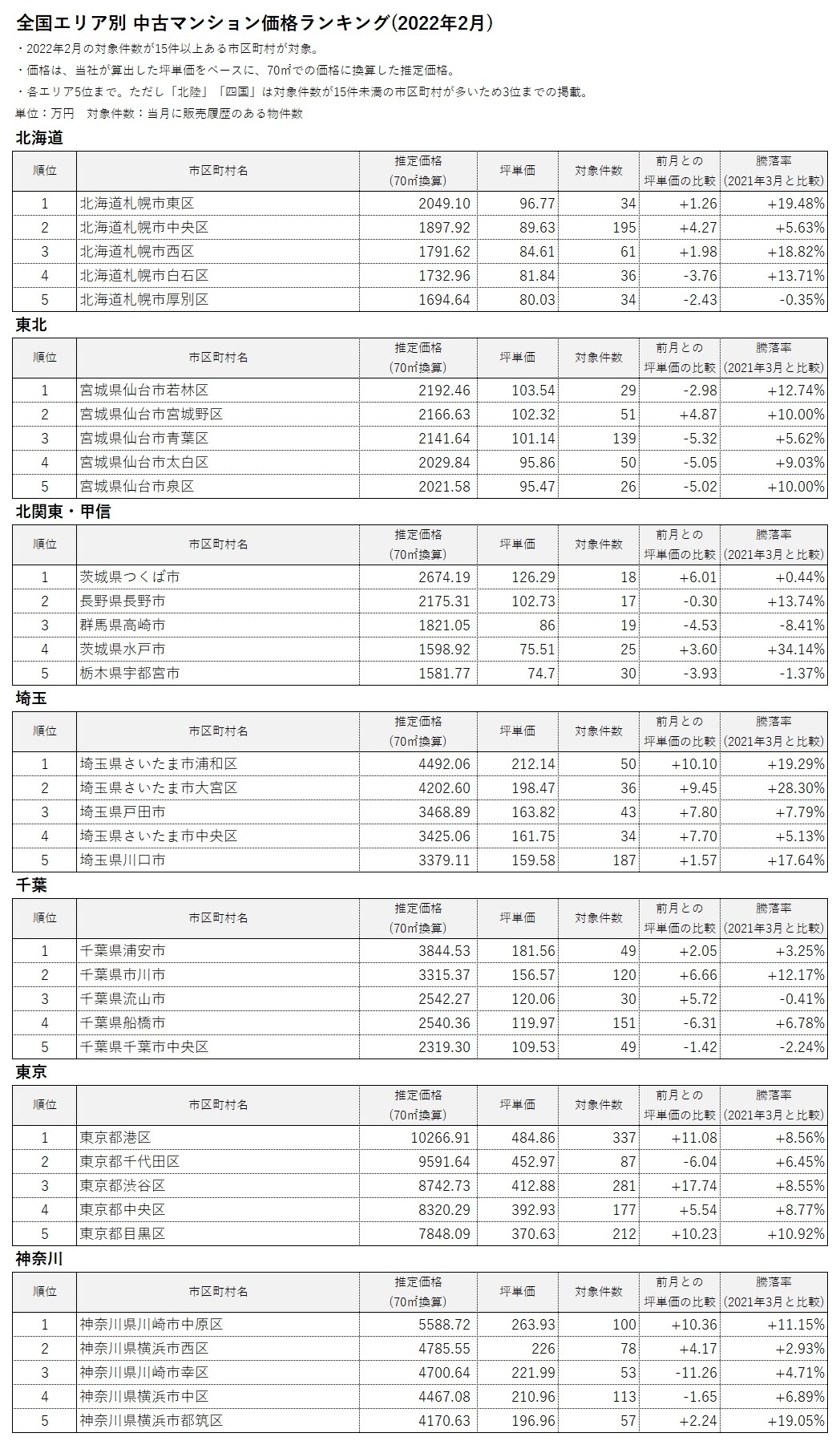 「マンションレビュー」2022年2月 全国市区町村 中古マンション価格ランキング100を発表