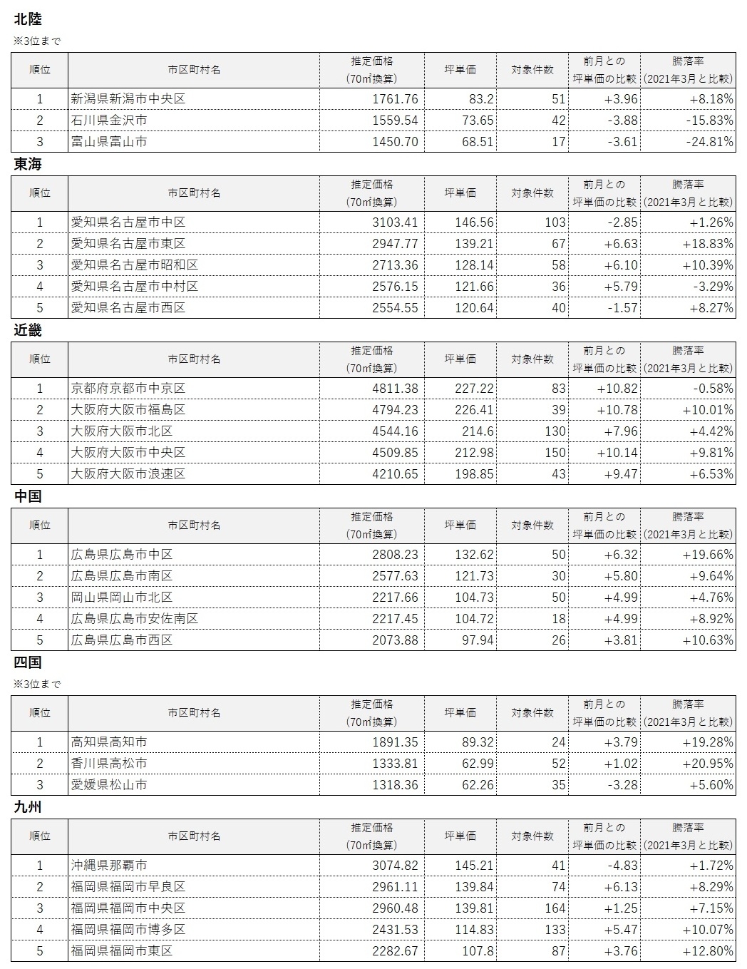 各エリア5位まで。ただし、「北陸」「四国」は対象件数が15件未満の市区町村が多いため3位までの掲載。