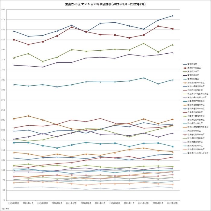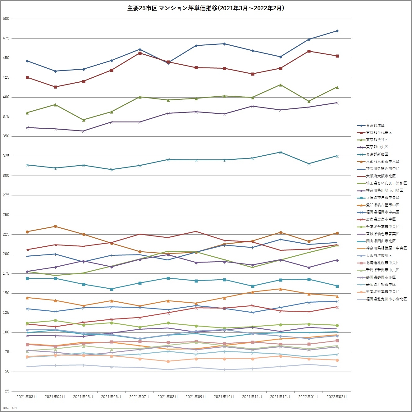 ■主要25市区 マンション坪単価推移(2021年3月~2022年2月)