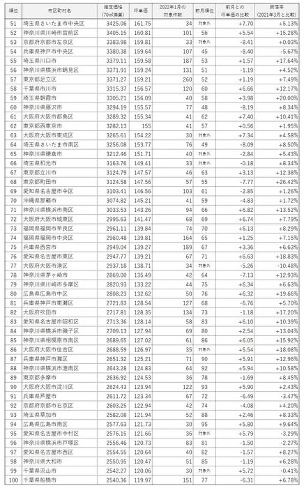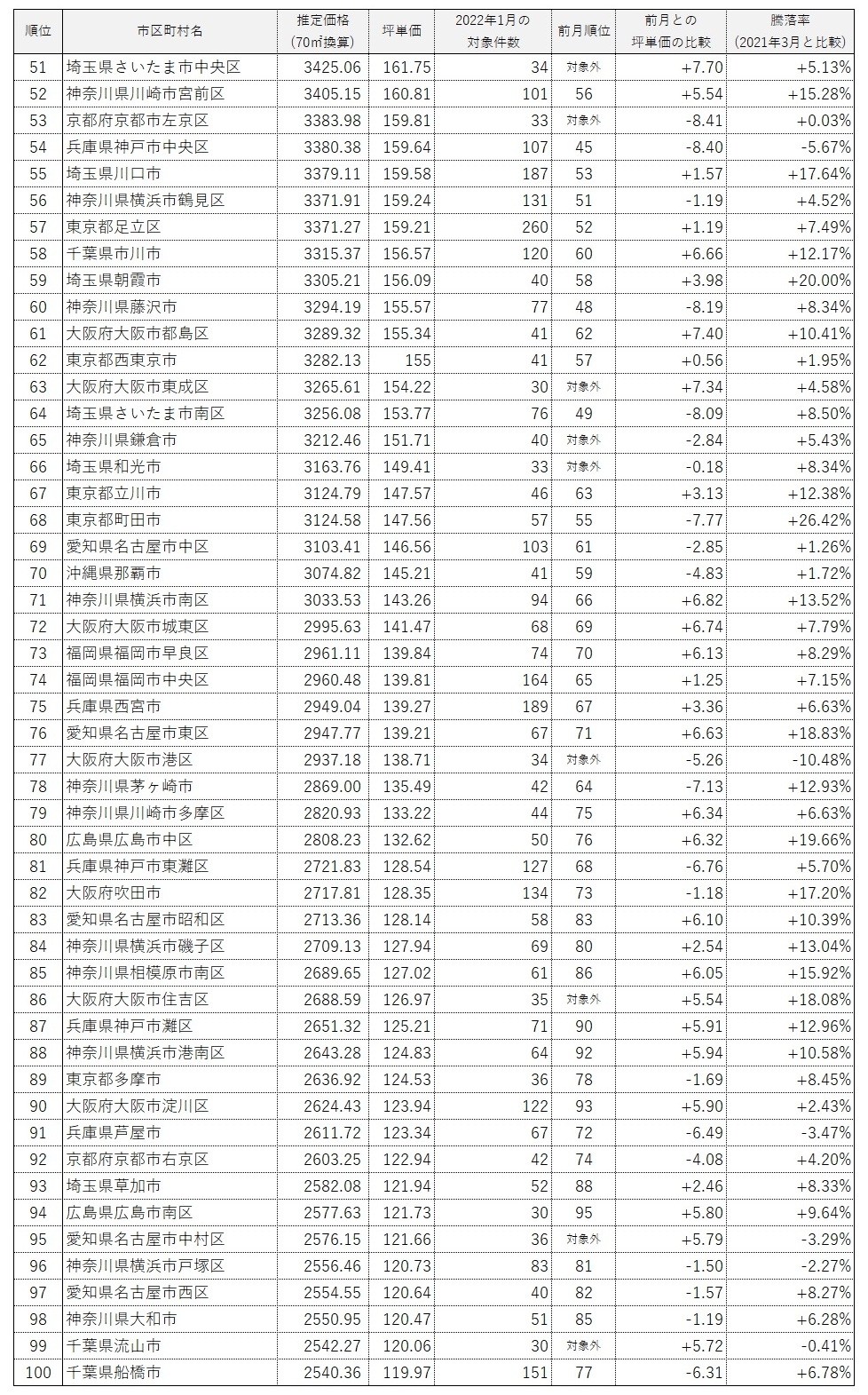 当社が保有する中古マンションの販売履歴データを元に「坪単価」を算出し、70㎡での価格に換算した「推定価格」によるランキング。2022年2月の対象件数(当月に販売履歴のある物件数)が30件以上ある全国199市区から、トップ100を掲載。