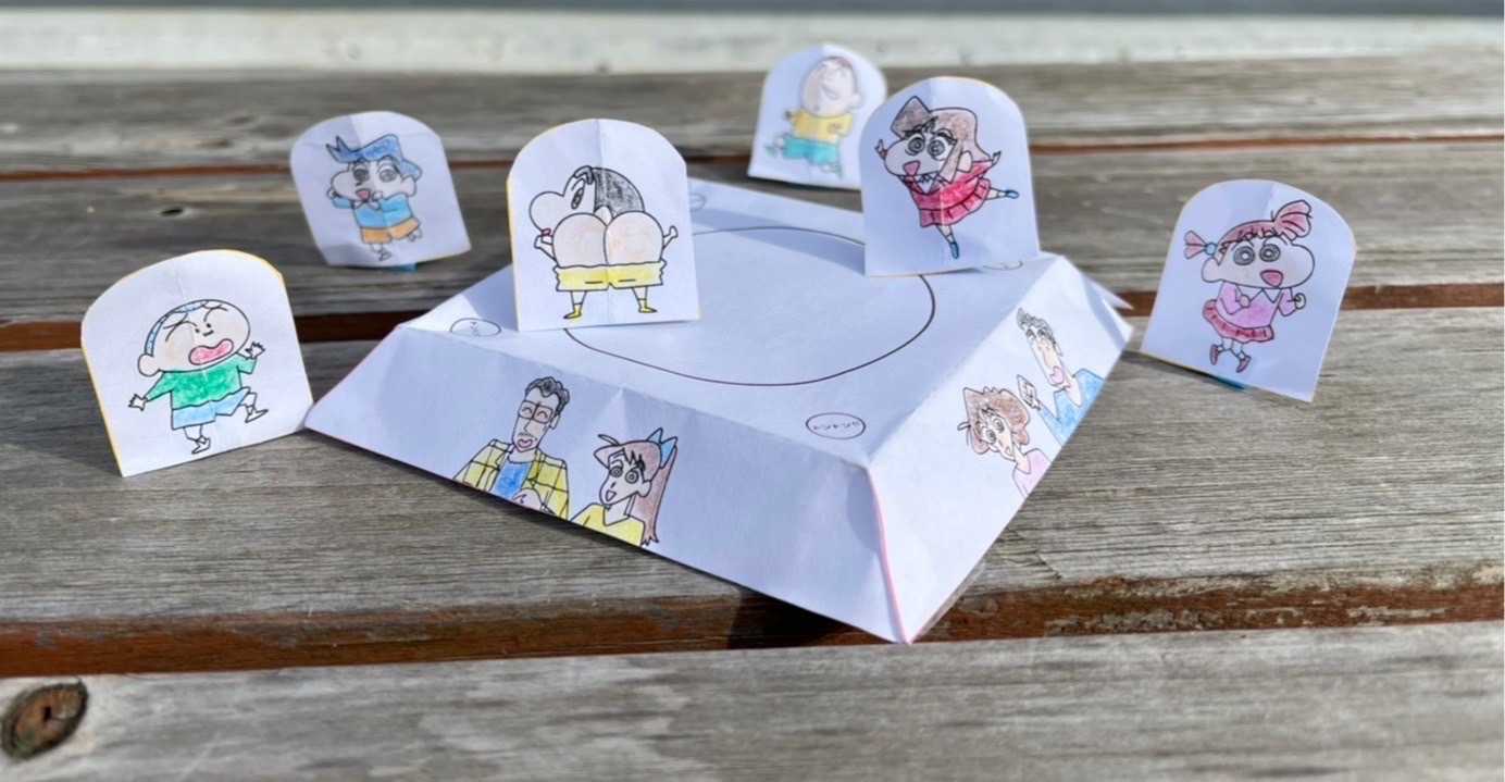 しんちゃんと仲間たち6人のキャラクターとゲーム台がデザインされた紙のキットに色を塗り、切り抜きし、組み立てて完成